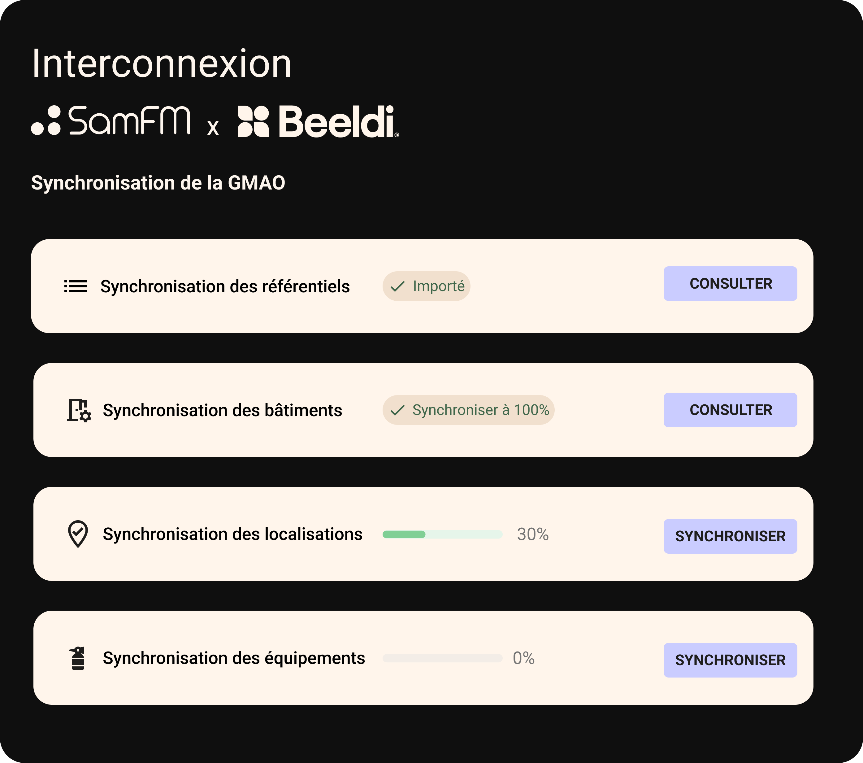 En connectant Beeldi à SamFM Prime, les gestionnaires et exploitants accèdent à une vision unifiée de leur patrimoine technique, sans rupture de données ni perte d’information entre deux outils. Ce qui permet : moins de friction, plus d’efficacité, et une valorisation durable des actifs.